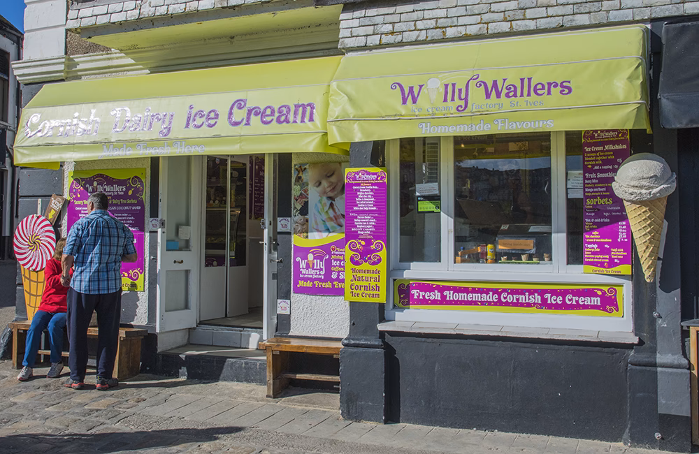 Willy Wallers Ice Cream Factory er den farvestrålende isbutik ved havnen i St Ives. De har et genialt roterende is-hjul, der hjælper dig med at vælge blandt deres enorme udvalg af "yumdiddlyumptious" smagsvarianter. Den livlige atmosfære og det brede udvalg gør det til et sjovt og spændende sted at vælge din næste isoplevelse. Uanset om du er til klassiske smage eller mere eventyrlige kombinationer, vil du sandsynligvis finde noget, der frister dig her.