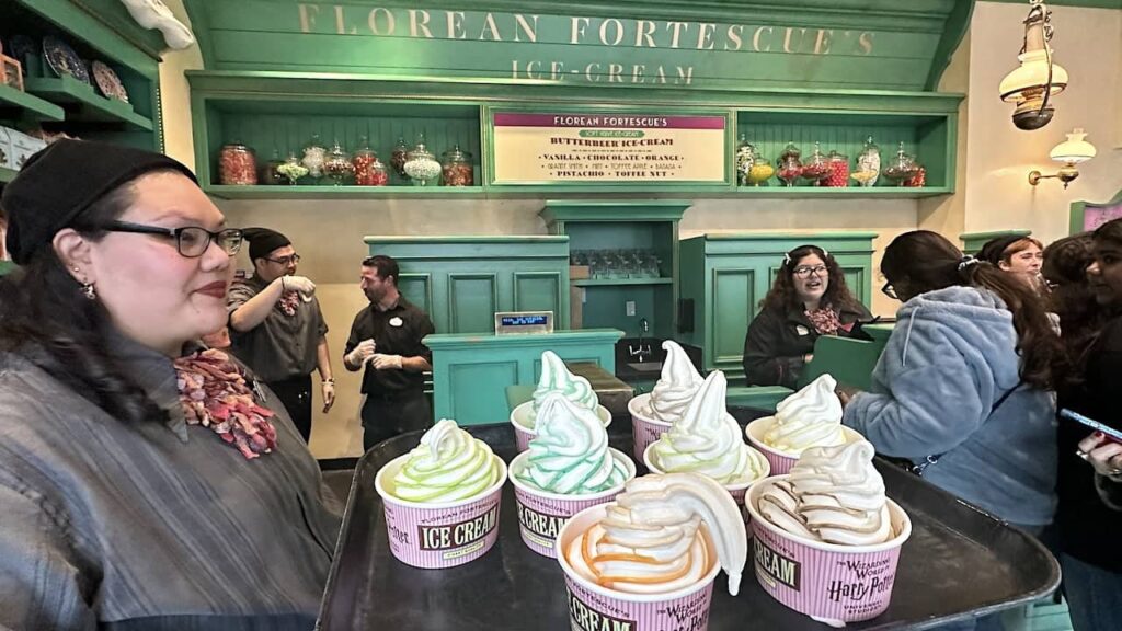 Harry Potter nød flere forskellige istyper der. Ved sit første besøg fik han en chokolade- og hindbæris med hakkede nødder. I 1992 købte han jordbær- og peanutbutteris til sig selv, Ron og Hermione. Under sit længere ophold i 1993 fik han desuden gratis sundaes hver halve time.