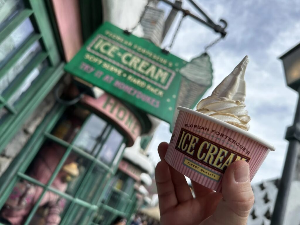 Mens den primære iskremkiosk tilbyder et bredt udvalg af traditionelle og innovative smage, er der én specifik type iskrem, der har fanget fantasien hos utallige besøgende, især fans af en vis magisk verden: Butterbeer iskrem. Denne unikke smag er så eftertragtet, at den har sin egen særlige placering, lige rundt om hjørnet fra den primære iskremkiosk. Du kan finde den uimodståelige Butterbeer iskrem hos Fountain of Fair Fortune eller The Hopping Pot. Begge steder er kendt for at servere denne cremede, søde og let karamelliserede delikatesse, der smager som flydende magi.