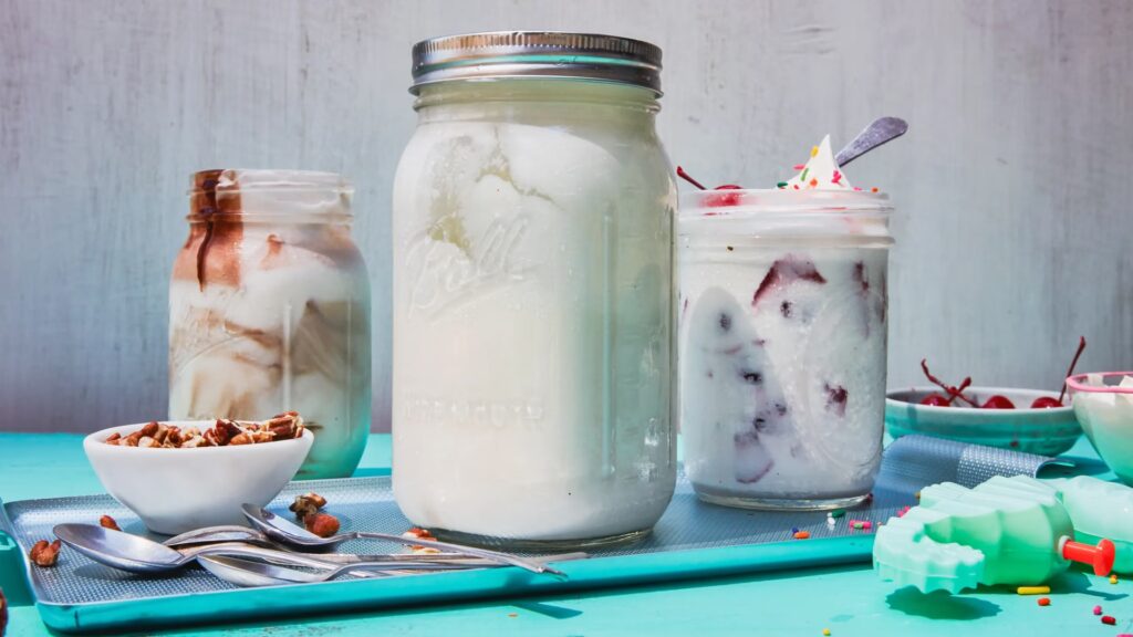 - Brug et bredmundet syltetøjsglas: Dette gør ikke kun rysteprocessen lettere, men også nydelsen af isen direkte fra glasset. Det er også bedre, hvis du ønsker at bruge en piskeris til at fremskynde fortykkelsen.