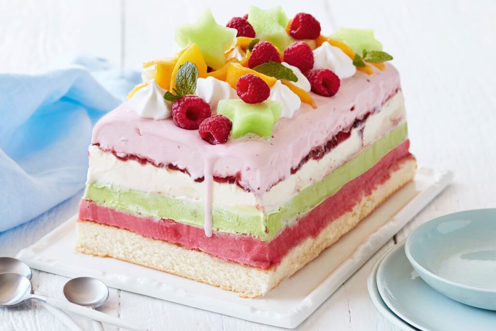 - Frys: Dæk kagen med plastfolie og frys i mindst 4 timer, eller gerne natten over, for at sikre, at islagene er helt faste. Jo længere den fryser, jo bedre holder den formen, når den skæres.