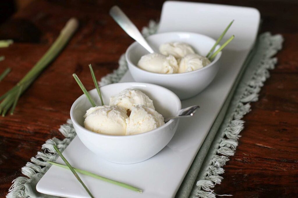 • Til Krydrede Retter: Som nævnt kan citrongræs hjælpe med at dæmpe stærk krydret mad. Server en lille skefuld citrongræs-is som en kølende kontrast efter et thailandsk karryret eller en anden krydret asiatisk ret.