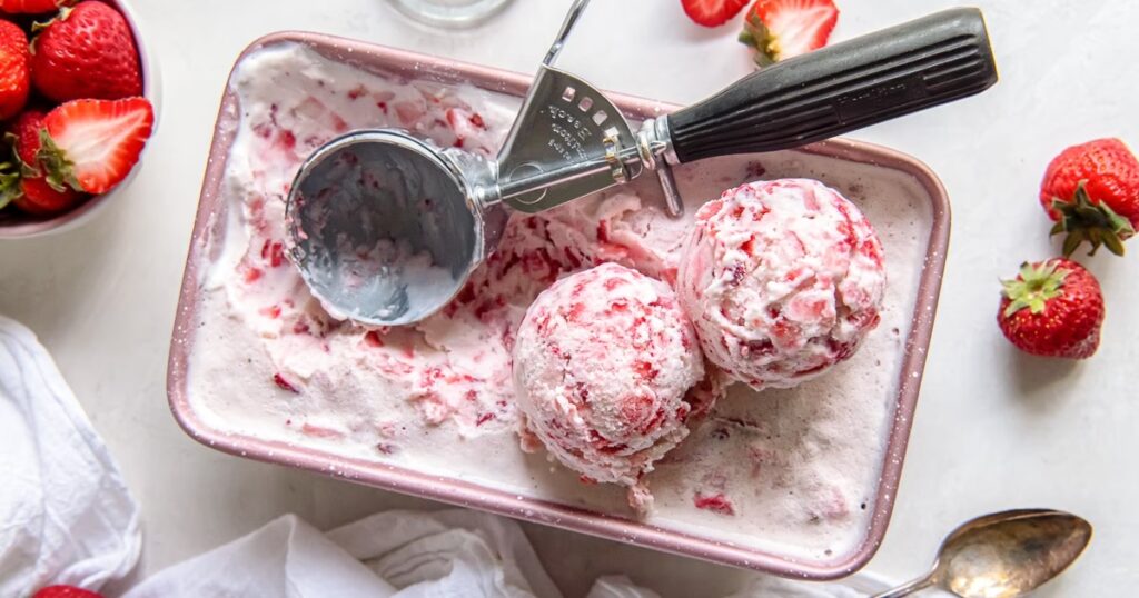 Da jeg først havde besluttet, at en kogt jordbærsauce skulle være en del af min opskrift, skulle jeg bare finde en måde at inkorporere den friske jordbærsmag på. Det gjorde jeg ved at hakke flere bær, tilsætte sukker og purere dem med min stavblender. Derefter kombinerede jeg den kogte jordbærsauce med den friske jordbærpuré og blandede det med min vanillecreme. Resultatet? Jordbærpuréen forstærkede den sarte lyserøde farve og tilføjede den lette, friske smag af bær plukket direkte fra haven. Med en kombination af kogt jordbærsauce og frisk jordbærpuré ramte jeg plet. Denne endelige version blev universelt elsket, ikke kun af mig, men også af min mand og vores børn, som tilsammen har seksten års erfaring med isspisning. Jeg betragter dem som skarpe smagsdommere.