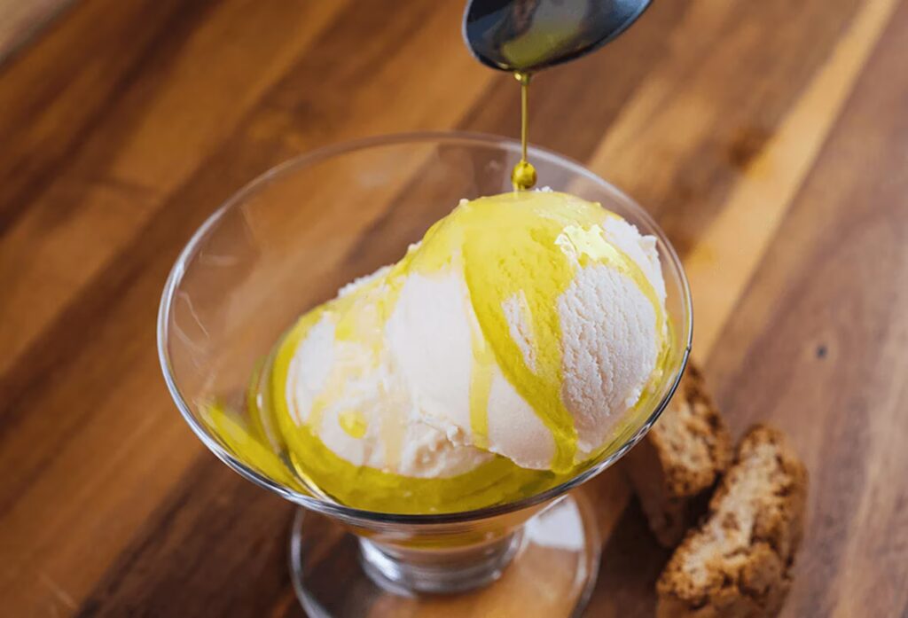 - Kage: Server et scoop olivenolieis ovenpå en skive olivenoliekage for en ultimativ smagsoplevelse, der forstærker de delikate olivenolienoter i begge dele. En klat flødeskum og frisk frugt vil gøre det til en uforglemmelig dessert.