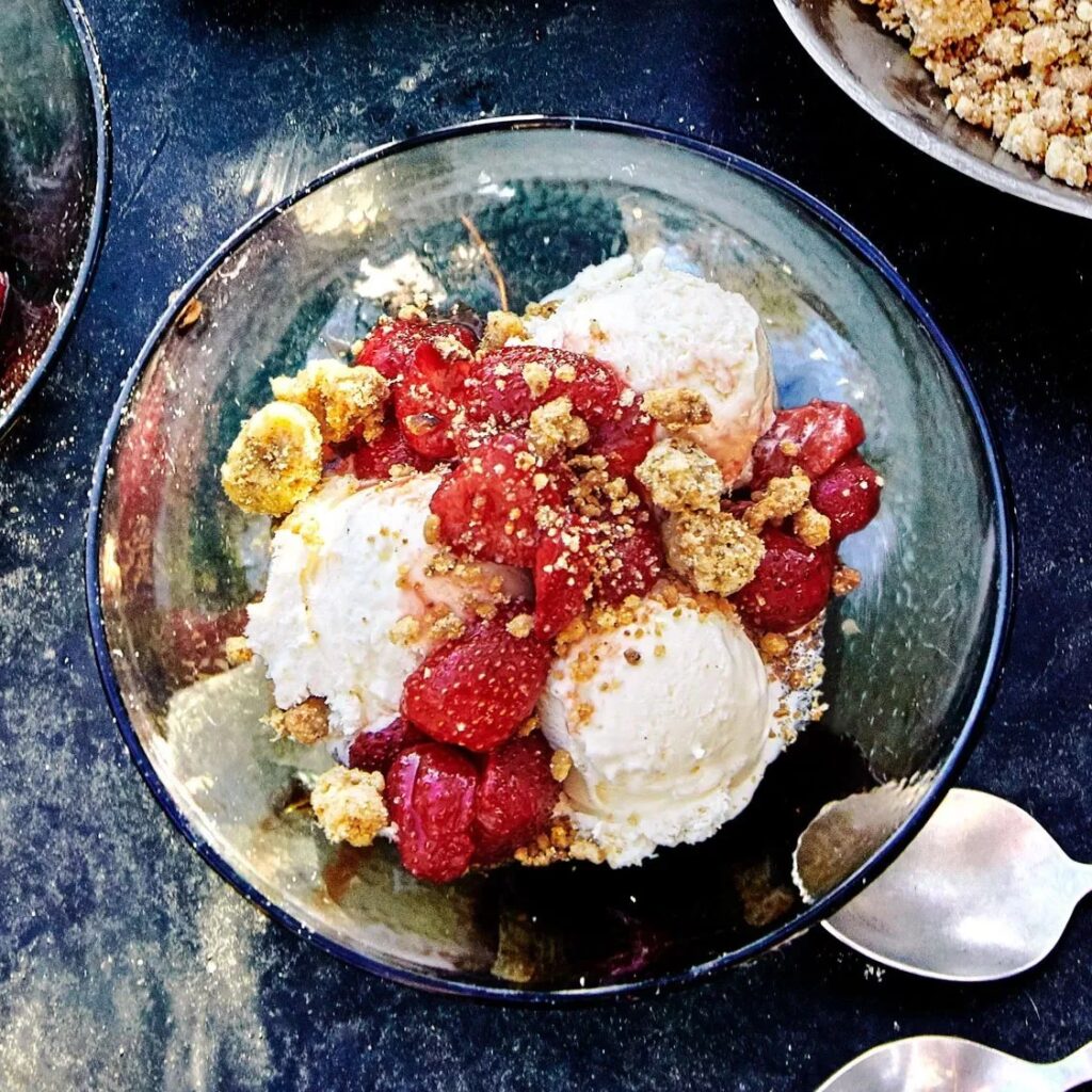 - Pistacie- og Frugt Crumble: En varm frugtcrumble med æbler, pærer eller bær, toppet med en sprød crumble lavet med smør, mel, sukker og masser af hakkede pistacienødder. Serveres varm med vaniljeis.